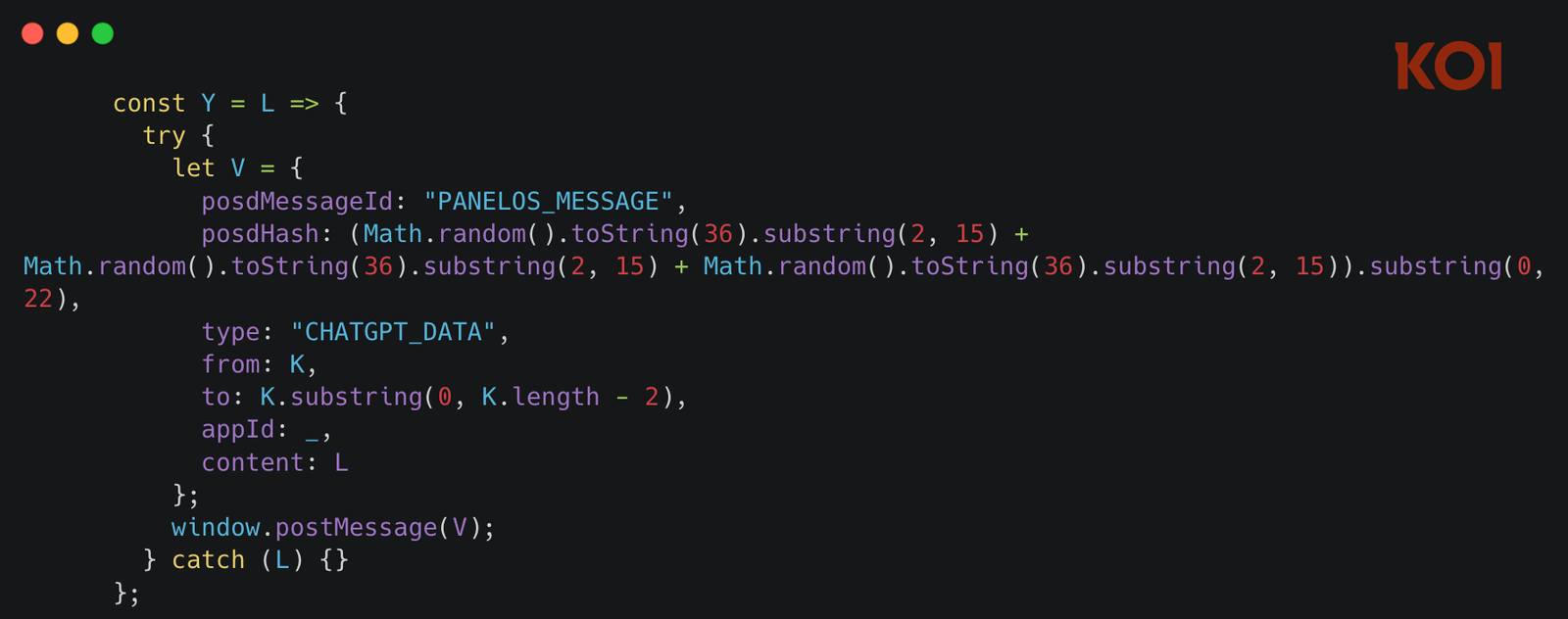 The injected script parses the intercepted API responses to extract conversation data – your prompts, the AI’s responses, timestamps, conversation IDs. This data is packaged and sent via window.postMessage to the extension’s content script, tagged with the identifier PANELOS_MESSAGE.