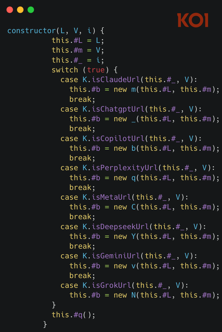 The extension monitors your browser tabs. When you visit any of the targeted AI platforms (ChatGPT, Claude, Gemini, etc.), it injects an “executor” script directly into the page. Each platform has its own dedicated script – chatgpt.js, claude.js, gemini.js, and so on.