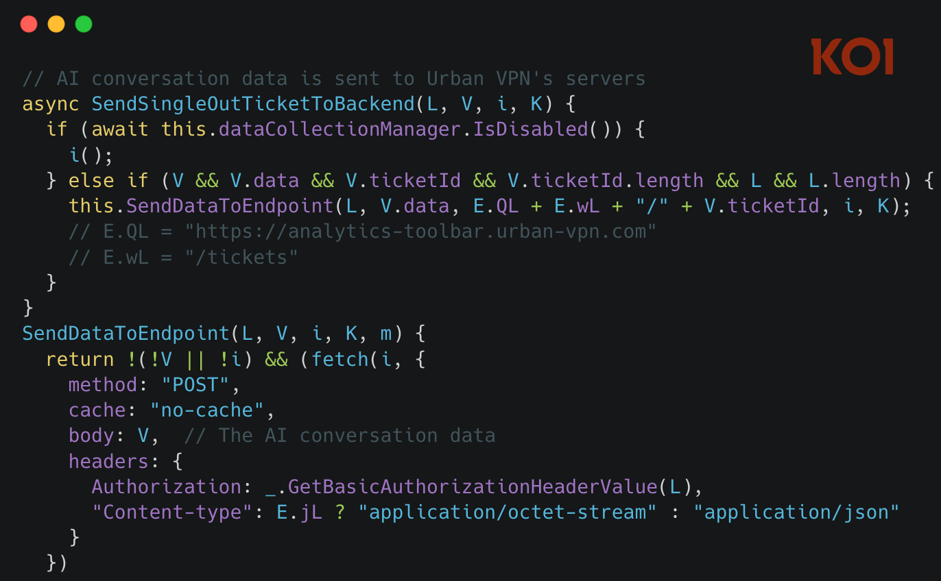 The protection feature shows occasional warnings about sharing sensitive data with AI companies. The harvesting feature sends that exact sensitive data – and everything else – to Urban VPN’s own servers, where it’s sold to advertisers. The extension warns you about sharing your email with ChatGPT while simultaneously exfiltrating your entire conversation to a data broker.