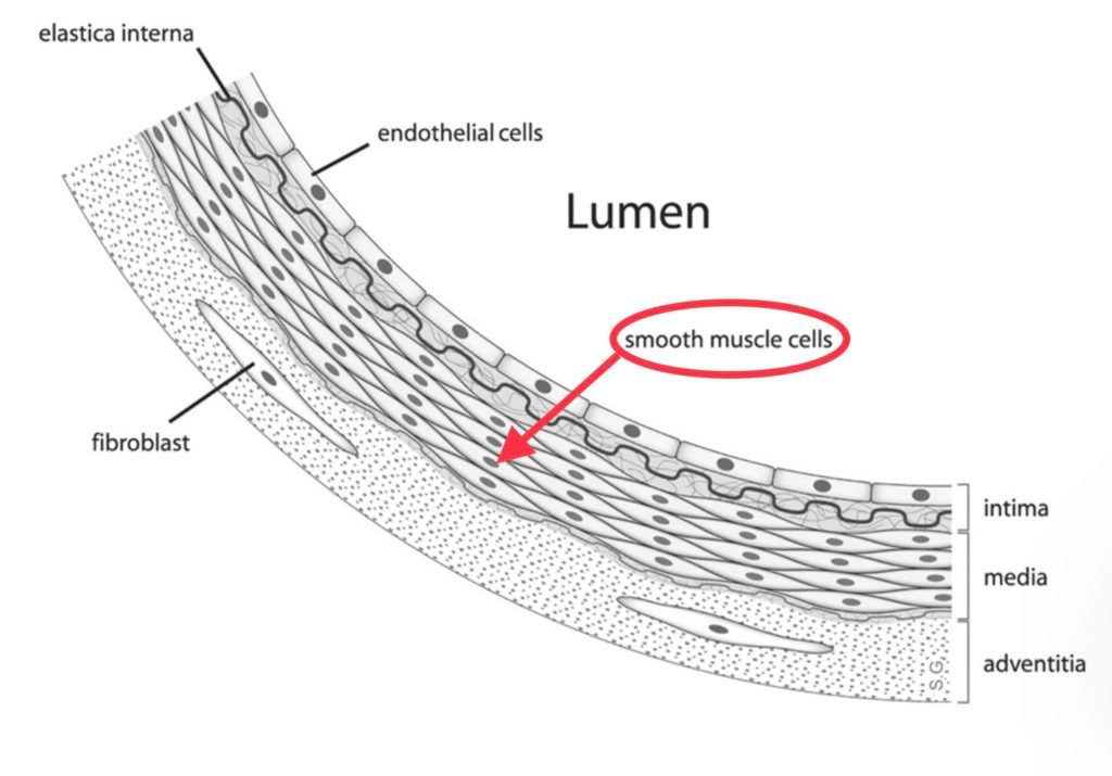 All blood vessels are wrapped by a thin sheathe of vascular smooth muscle cells (VSMCs). The current scientific consensus has the vasculature system as a spiderweb of ever-narrower channels for blood, powered by the heart as a central pump, and supporting systems such as the brain, stomach, limbs, and so on by bringing them nutrients and taking away waste. The sheathe of muscle wrapped around blood vessels undulates in a process called “vasomotion” that we think helps blood keep circulating, much like peristalsis in the gut helps keep food moving, and can help adjust blood pressure.