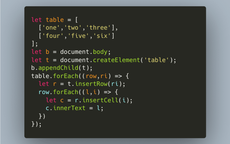 let table = [ ['one','two','three'], ['four','five','six'] ]; let b = document.body; let t = document.createElement('table'); b.appendChild(t); table.forEach((row,ri) => 🔥); |