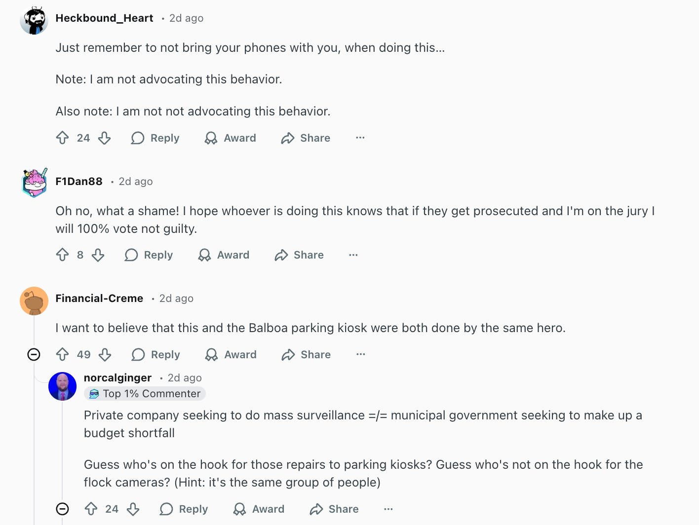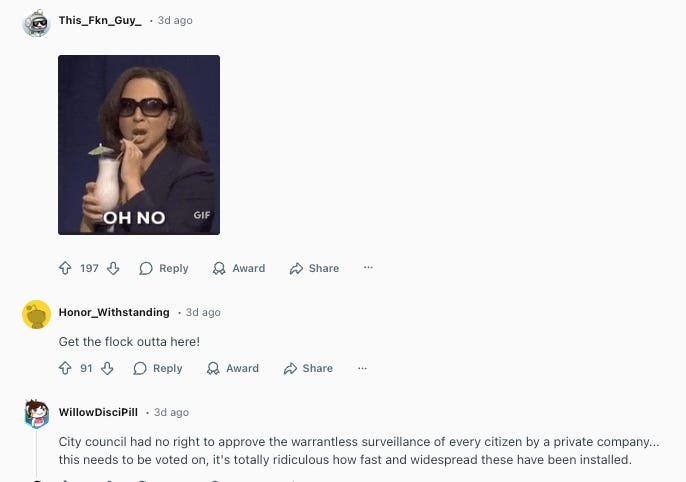 The San Diego reddit threads carrying news of the destroyed Flock equipment told a similar story: