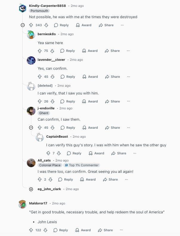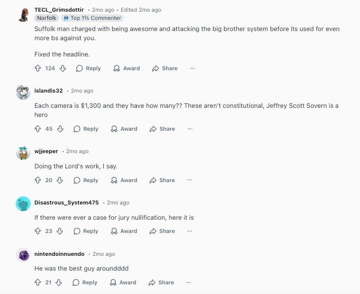 In his GoFundMe, Sovern also mentioned the support for him he’d seen on forums online, so I went over to Reddit to get a sense for how his actions were being received online. Here was the page that shared news of his arrest for destroying the Flock cameras: