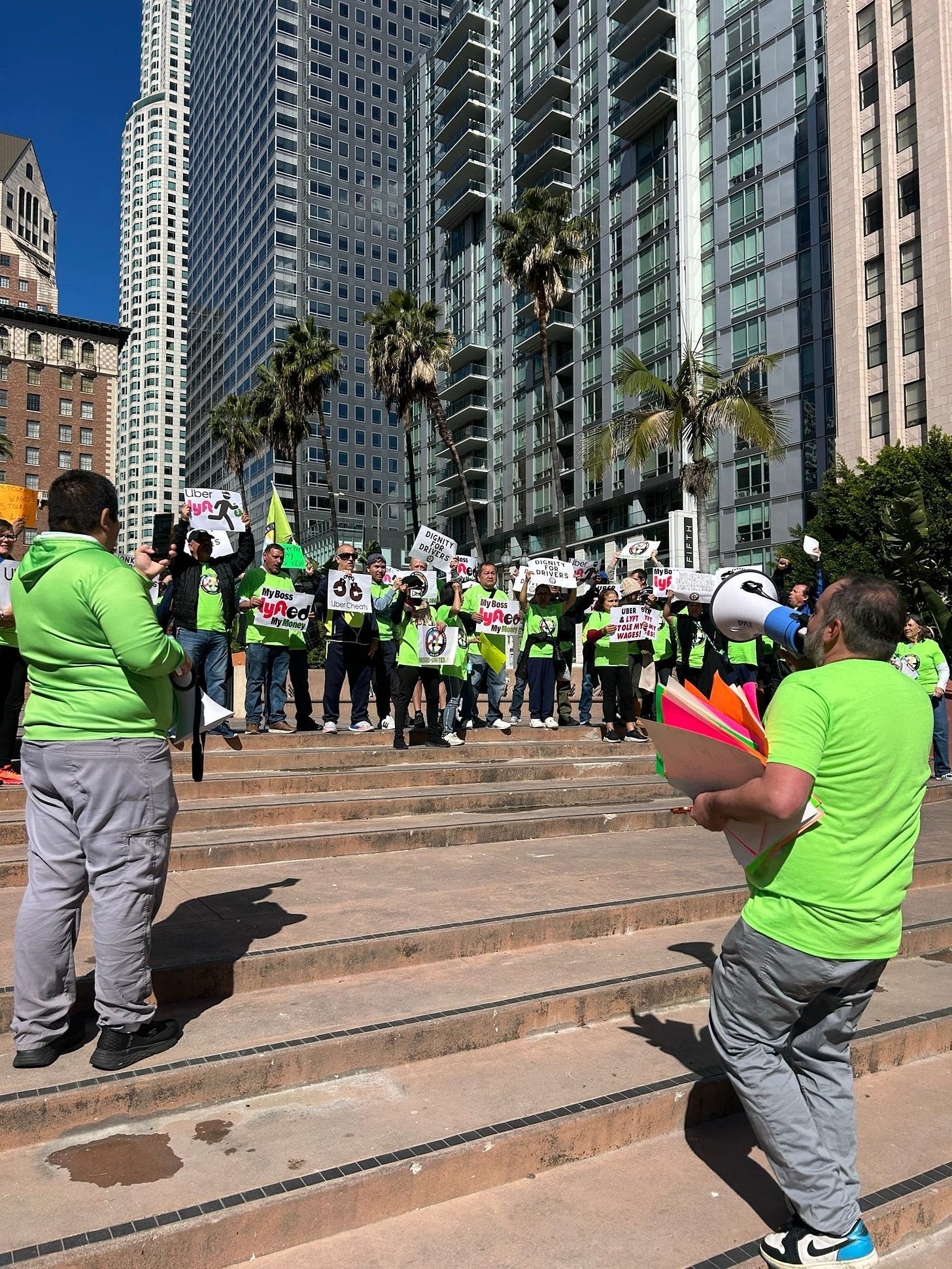 On Wednesday, I headed to Pershing Square in downtown Los Angeles, where dozens of gig workers and organizers with Rideshare Drivers United had assembled to deliver a petition to the California Labor Commission signed by thousands of workers, calling on the body to deliver a settlement on their behalf. Organizers made short speeches on the steps of the square while local radio and TV stations captured the moment. “