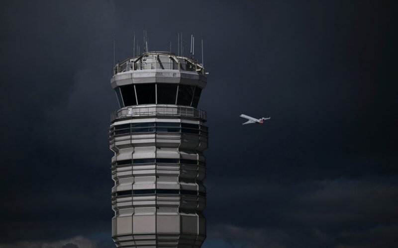 An airplane takes off from the control tower at Reagan National Airport in Arlington, Virginia, on October 8, 2025.