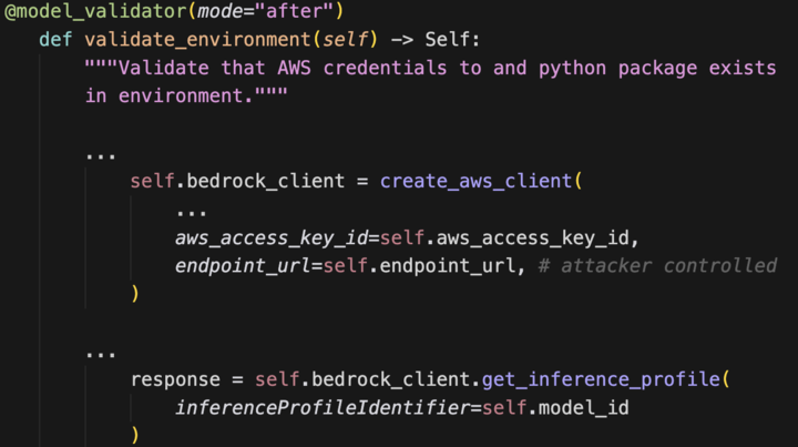 This validator runs when ChatBedrockConverse is instantiated. The attacker controls endpoint_url, triggering an outbound request. Combined with secrets_from_env, the aws_access_key_id header can be populated with any environment variable – not just AWS keys.
