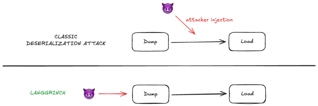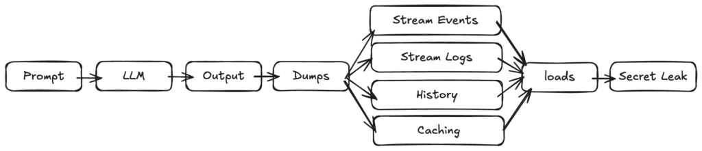- One prompt can trigger a lot of machinery. The most common real-world path here is not “attacker sends you a serialized blob and you call load().” It’s subtler: LLM outputs can influence fields like additional_kwargs or response_metadata, and those fields can be serialized and later deserialized through normal framework features like streaming logs/events. Plainly, this means an exploit can be triggered by a single text prompt that cascades into a surprisingly complex internal pipeline.