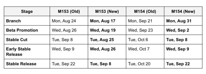 The new release schedule begins with beta and stable (version 153) versions of Chrome on September 8, 2026, and will apply to all platforms, including desktop, Android, and iOS. No changes have been made to other early release platforms, such as the Dev and Canary channels.