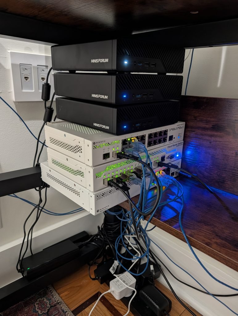 MS-R1 on the top, then two MS-01s, MikroTik CCR2004-16G-2S+PC, CRS309-1G-8S+IN and CSS610-8P-2S+IN.