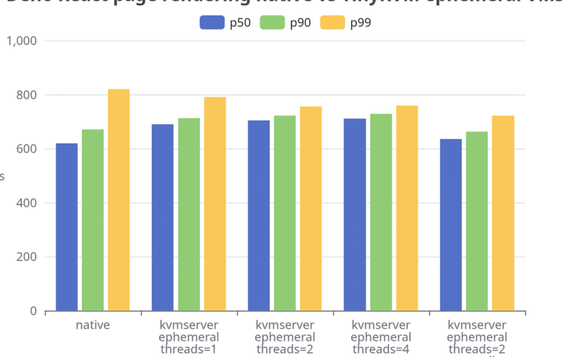 So we ran a full Deno page rendering benchmark in TinyKVM and then also the very same (unmodified) benchmark natively. We made GC single-threaded in order to compare equally. It would normally run async in another thread, but you’d still have to pay the cost of doing it. What we found was that TinyKVM generally had lower p90+ latency, while native had better p50.
