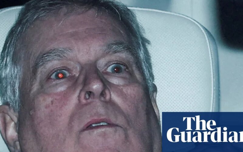 THey he says the camera adds 10 pounds. Does it also add a sudden, terrifying understanding of the abject horror of existence? Phil Noble clearly does. A Reuters photographer’s shot of Andrew Mountbatten-Windsor leaving Aylsham Police Station in the back of his Range Rover is an image of shock, pain and horror. Noble’s harsh, blinding flash paints Andrew pink, red, and white—his skin is diseased, his eyes hollow and red like rats. His hands are lowered as if in prayer, as if he is begging a higher power to forgive him.