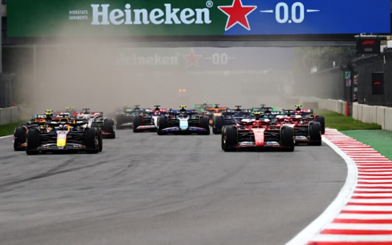 Max Verstappen of the Netherlands driving (1) Oracle Red Bull Racing RB20 Carlos Sainz of Spain driving (55) Ferrari SF-24 and Lando Norris of Great Britain driving (4) McLaren MCL38 Mercedes into Turn 1 at the start during the Formula 1 Grand Prix of Mexico at Autodromo Hermanos Rodriguez