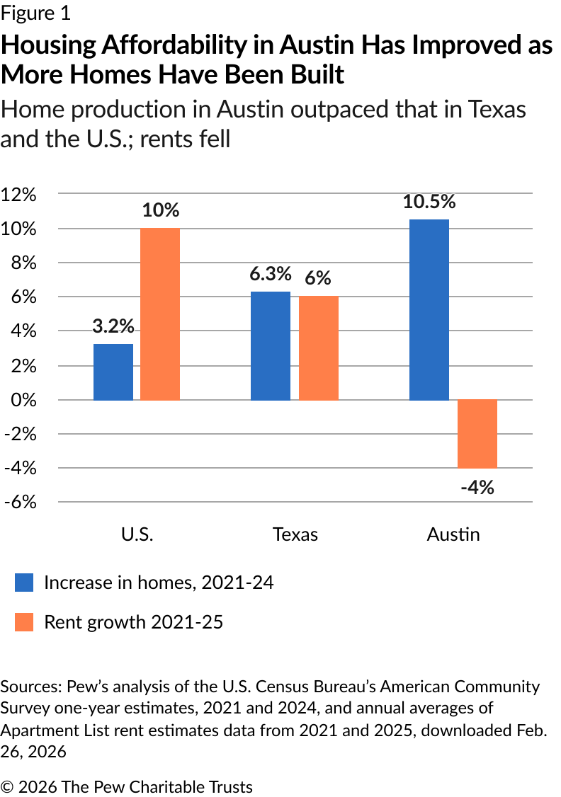 A combination of strong demand and proactive policy changes spurred Austin’s housing supply surge, benefiting its residents, who saw the steepest rent declines of any large U.S. city from 2021 to 2026.