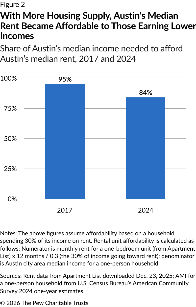 These decreases in rent have led to real improvements in affordability for Austin renters. In 2017, the city’s median rent for a one-bedroom unit was affordable to a single-person household earning 95% of the area median income (AMI). Seven years later, that number had declined to 84%. (See Figure 2.)
