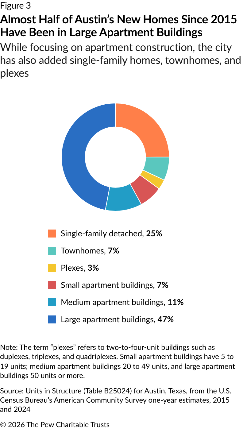 Austin added 120,000 new homes from 2015 to 2024 by encouraging a variety of home types throughout the city. (See Figure 3.) Large apartment buildings account for almost half of the new units, while one-third were new single-family homes or townhomes. Construction of 2,850 ADUs accounted for a meaningful share (7%) of Austin’s new detached and attached single-family homes and townhomes. Austin’s suburbs have also grown, adding 214,000 new units from 2015 to 2024, but with a different type of housing: 77% were single-family homes or townhomes.