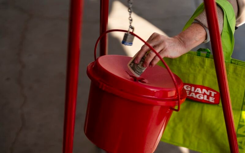 A woman puts money into a red Salvation Army kettle outside a Giant supermarket in Alexandria, Virginia on November 22, 2023.