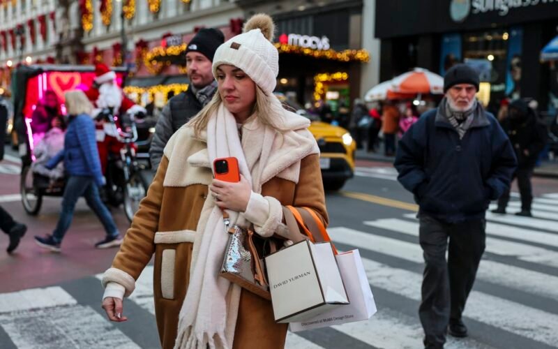 A woman carries shopping bags as people make their way through Herald Square on December 11, 2025 in New York City.