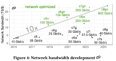 We have good news here, finally. Network bandwidth per dollar exploded by 10x. And absolute speeds went from 10 Gbit/s to 600 Gbit/s (60x).
