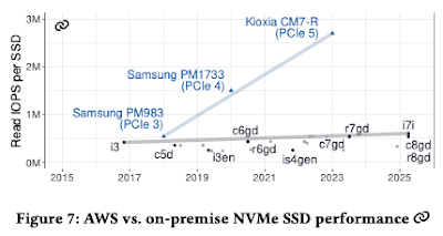 SSD capacity has stagnated since 2019 and I/O throughput since 2016. This sharply contrasts with on-prem hardware, where SSD performance doubled twice (PCIe 4 and PCIe 5) in the same timeframe. The gap between cloud and on-premise NVMe is widening rapidly.