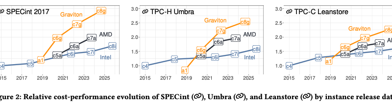 Multi-core parallelism has skyrocketed in the cloud. Maximum core counts have increased by an order of magnitude over the last decade. The largest AWS instance u7in now boasts 448 cores. However, simply adding cores hasn’t translated linearly into value. To measure real evolution, the authors normalized benchmarks (SPECint, TPC-H, TPC-C) by instance cost. SPECint benchmarking shows that cost-performance improved roughly 3x over ten years. A huge chunk of that gain comes from AWS Graviton. Without Graviton, the gain drops to roughly 2x. For in-memory database benchmarks, gains were even lower (2x–2.5x), likely due to memory and cache latency bottlenecks.