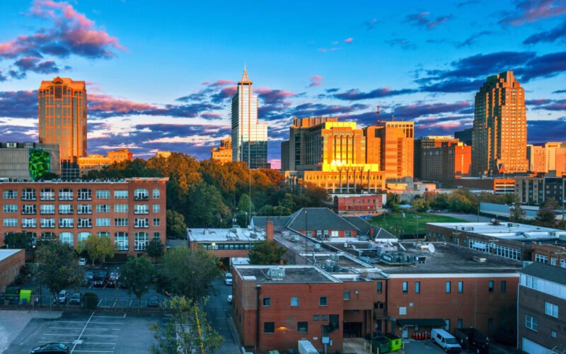 An aerial view of downtown Raleigh from the Warehouse District.
