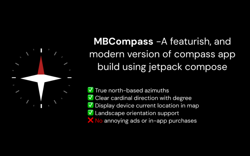 MBCompass is a modern, free, and open-source compass and navigation app without ads, IAP, or tracking. Built with Jetpack Compose, it supports compass and navigation features while being lightweight and simple.