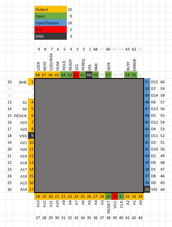 The processor fits into a PLCC-68 socket. The pins of the socket are not suitable for plugging in jumper wires directly, so the socket was mounted onto an adapter PCB with jumper-compatible headers. The pinout of both the chip and the socket is included in the datasheet, but the adapter PCB complicates things a bit, so I created a small conversion table to make my life easier.
