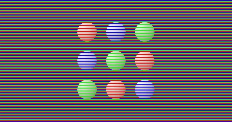 This is one of my favorite illusions in the collection. The circles (or spheres) look red, blue, or green, but in reality they are all the same grayish color. Our brain “colorizes” them based on the lines that overlap the shapes. Don’t believe it? Mouse over the illustration.