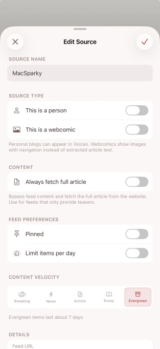 It can fetch full article text from the web even if the website itself is set to truncate its feeds (as many sites do to incentivize people to visit), and you can tag sources as webcomics to open up an image-first reader experience. You can also mute sources for a week and pin the ones you can’t miss upstream.