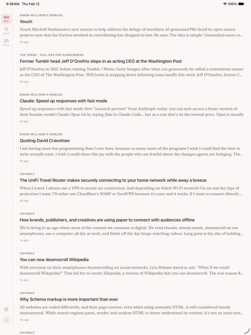 However, Current suggests a different RSS experience. Instead of organizing feeds as lists to be processed, or turning unread counts to zero, the app’s home screen is a river.