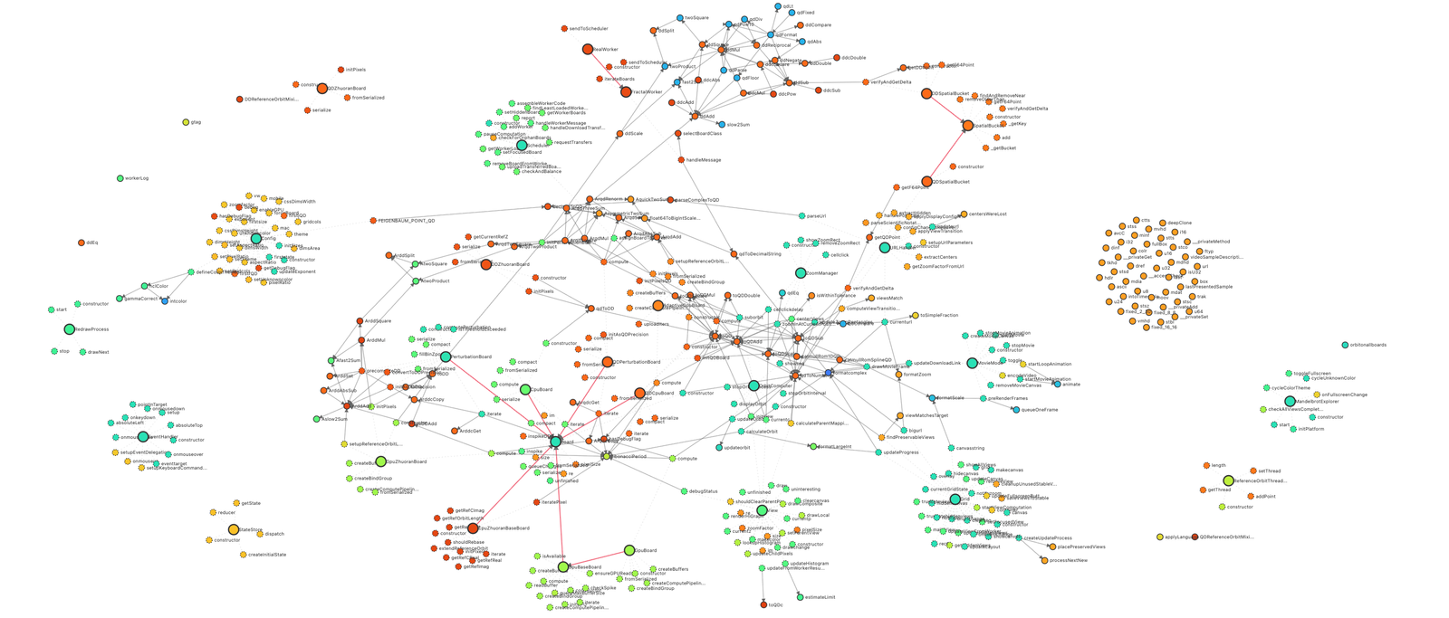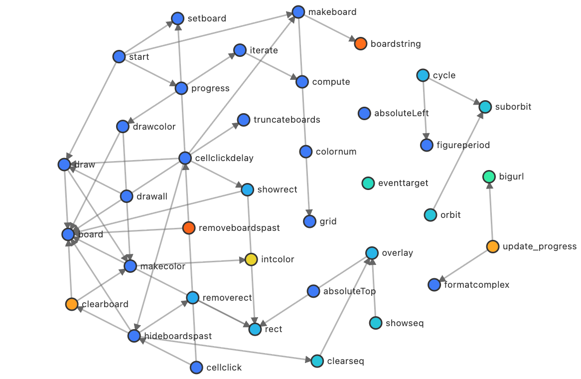 The last human-written version of the webpage without LLM assistance was 780 lines; you can see its 37 functions diagrammed below. It is a nice elegant piece of code, but pretty simplistic as a fractal implementation.
