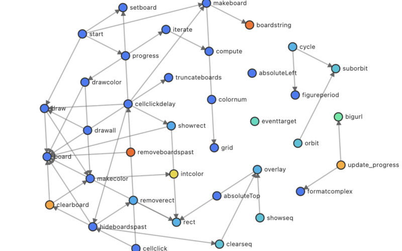 The last human-written version of the webpage without LLM assistance was 780 lines; you can see its 37 functions diagrammed below. It is a nice elegant piece of code, but pretty simplistic as a fractal implementation.