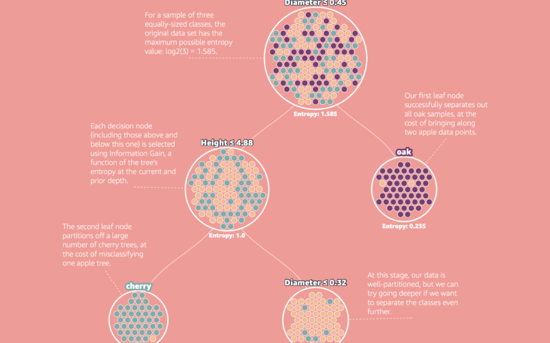 Of course, reading the steps of an algorithm isn’t always the most intuitive thing. To make things easier to understand, let’s revisit how information gain was used to determine the first decision node in our tree.