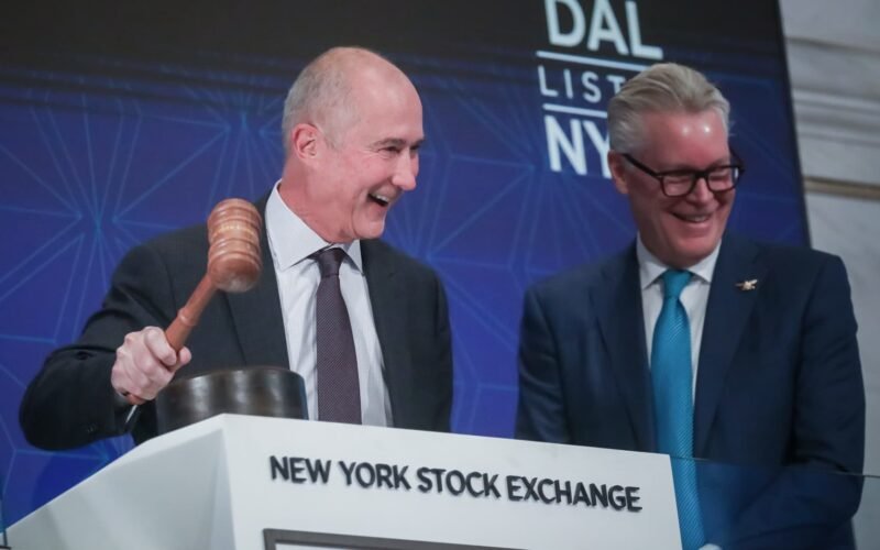 Glenn Hoenstine, president of Delta Air Lines, left, and Ed Bastian, CEO of Delta Air Lines, right, ring the opening bell on the floor of the New York Stock Exchange (NYSE) in New York, US, on Wednesday, November 12, 2025.