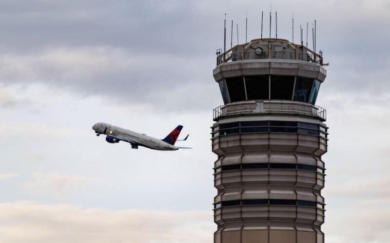A Delta Air Lines plane takes off near the air traffic control tower at Ronald Reagan Washington National Airport (DCA) in Arlington, Virginia, US, on Tuesday, October 28, 2025.