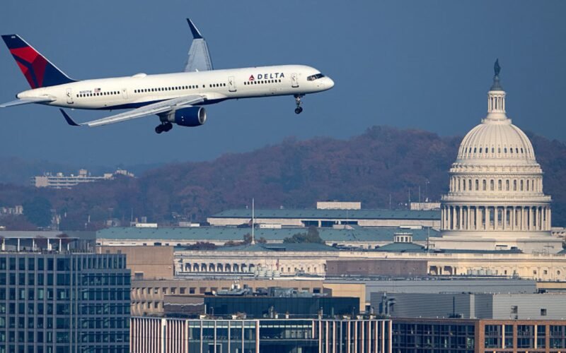 A Delta Air Lines Boeing 757-200 passes near the US Capitol Dome in Washington as it prepares to land at Ronald Reagan Washington National Airport on Sunday, November 9, 2025.
