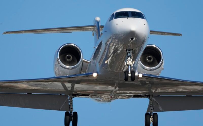 A FlexJet Gulfstream G450 aircraft approaches San Diego International Airport for landing on May 9, 2025 in San Diego, California.