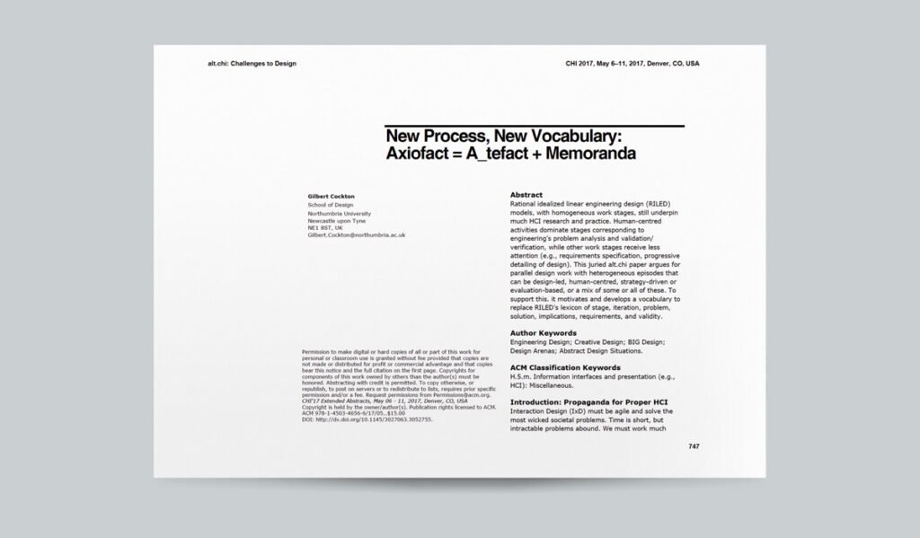 Cockton, G., 2017, May. New process, new vocabulary: Axiofact= a_tefact+ memoranda. In Proceedings of the 2017 CHI Conference Extended Abstracts on Human Factors in Computing Systems (pp. 747-757).