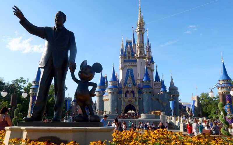 A statue of Walt Disney and Mickey Mouse stands in a park in front of Cinderella Castle at Magic Kingdom Park at Walt Disney World on May 31, 2024, in Orlando, Florida.