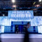 With the house lights on, Christine goes out to play on the mirrored stage and it slowly gets dark. Against Daniel Denton’s blurry, wavy video design, her blue dress seems to portend a watery death. The next time we see her, John is cradling her lifeless body.