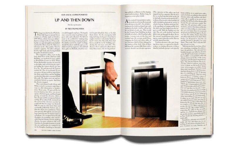 A long article about elevators might seem a bit dry, even for a magazine that once published a forty-thousand-word article about oranges. (“What is there to say, besides that it rises and falls?” Baumgarten asks arrogantly.) But, as Gerard Manley Hopkins almost said, there lives the dearest freshness in the highest things. Baumgarten’s story is not just a presentation of fascinating facts—there are, or were, fifty-eight thousand elevators in New York City; Taipei 101 Tower’s high-speed elevators are pressurized to prevent ear damage; All door-closing buttons in elevators built after the early 1990s are designed not to work, but they are also indelible analogies. Speedy video footage from surveillance cameras shows White stuck in the elevator car, looking like a “bug in a box.” At thirty-two hundred feet, the hoist rope would snap “like a stream of spit in a stairwell.”