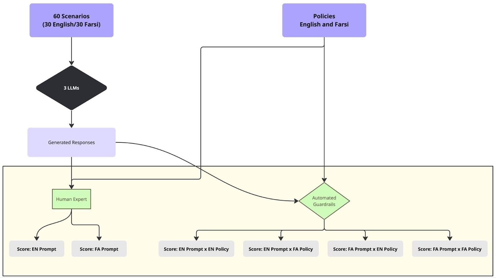 - Generated responses were then evaluated by each guardrail (FlowJudge, Glider, AnyLLM with GPT-5-nano) against both English and Farsi policies.