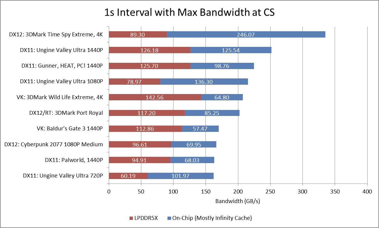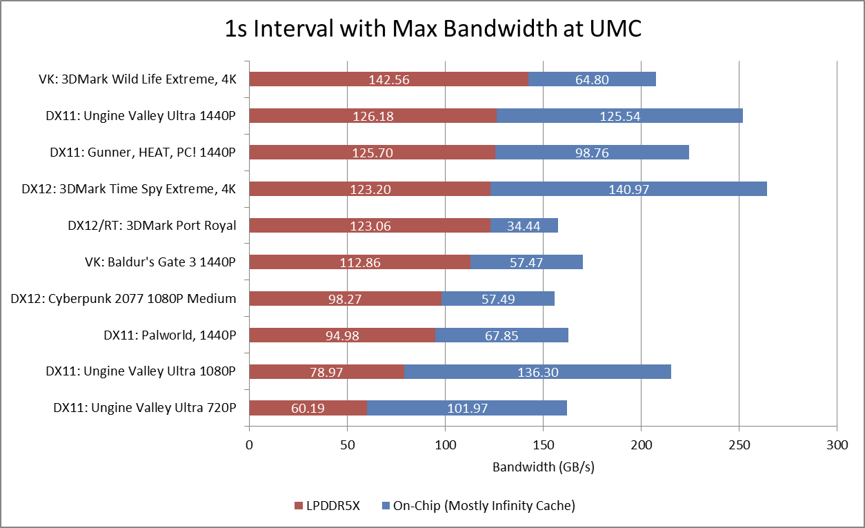 Picking an interval with maximum bandwidth demands at the CS gives an idea of how much bandwidth Strix Halo’s GPU can demand. Strix Halo has the same 2 MB of graphics L2 cache that AMD’s older 7000 series “Phoenix” mobile chip had, despite more than doubling GPU compute throughput. Unsurprisingly, the GPU can draw a lot of bandwidth across Infinity Fabric. 3DMark Time Spy again stands out. If AMD wanted to simply scale up DRAM bandwidth without spending die area on cache, they would need well over 335 GB/s from DRAM.