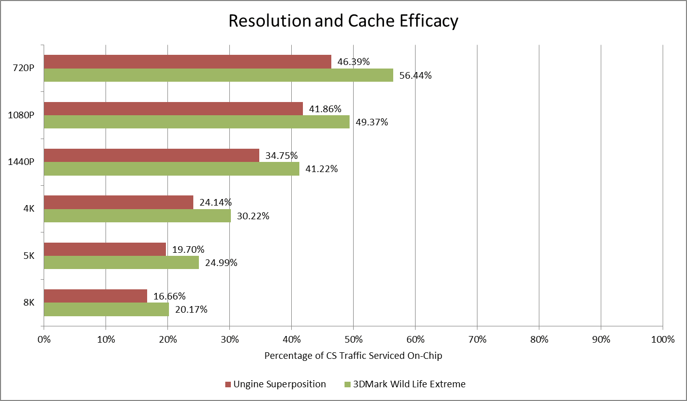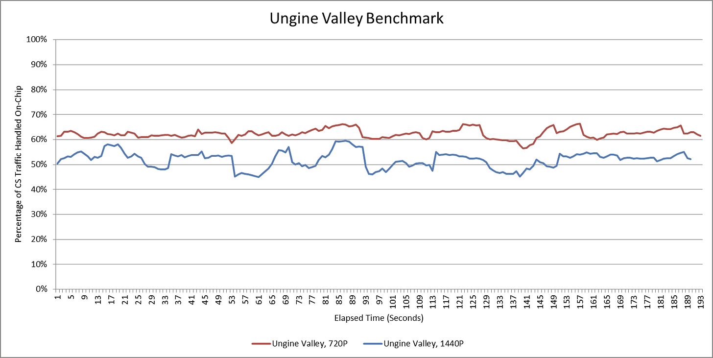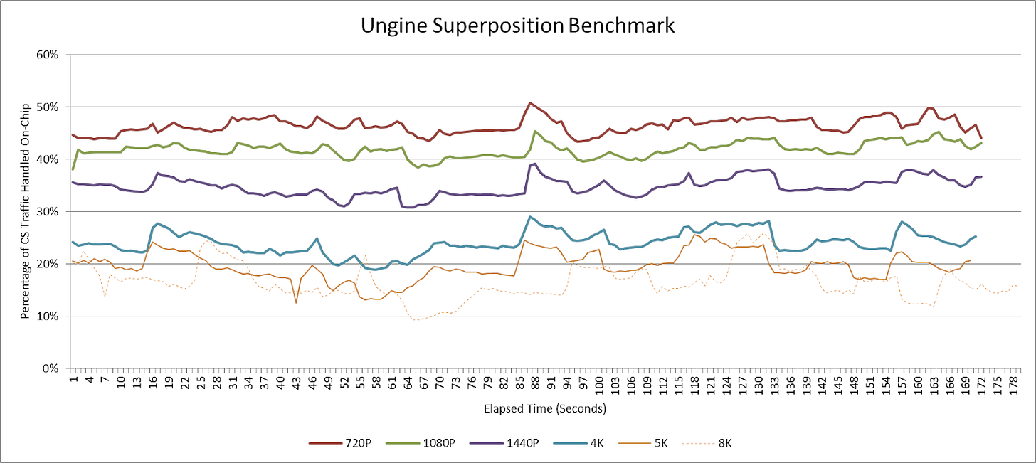 Ungine Superposition and 3DMark workloads can both target a variety of resolutions without regard to monitor resolution. Logging data throughout benchmark runs at different resolutions shows the 32 MB cache providing reasonable “bandwidth amplification” at reasonable resolutions. At unreasonable resolutions, the cache is still able to do something. But it’s not as effective as it was at lower resolutions.