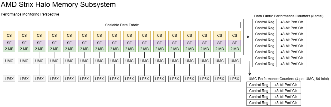 AMD’s Infinity Fabric aims to abstract away details of how data travels across the chip. It does so by providing endpoints with well defined interfaces to let blocks make or handle memory requests. Infinity Fabric also provides a set of programmable performance counters. AMD documents a single DATA_BW performance event that counts data beats at endpoints. DATA_BW targets an endpoint via its 8-bit instance ID, and can count either reads or writes. AMD never documented Infinity Fabric instance IDs for Strix Halo. So, I did some guessing by generating traffic at various blocks and observing bandwidth counts at all possible instance IDs.