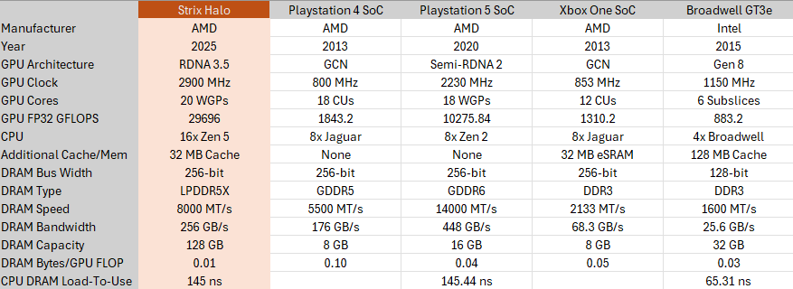 At a higher level, GPU bandwidth demands have been a persistent challenge for large iGPUs and have driven a diverse set of solutions. Over a decade ago, Intel created “halo” iGPU variants and paired a 128 MB eDRAM cache while sticking with a typical 128-bit client memory bus. AMD’s console chips use large and fast DRAM buses. The PS5 is one example. Strix Halo does a bit of both. It combines modest cache capacity with a more DRAM bandwidth than typical client chips, but doesn’t rely as much on DRAM bandwidth as console chips.