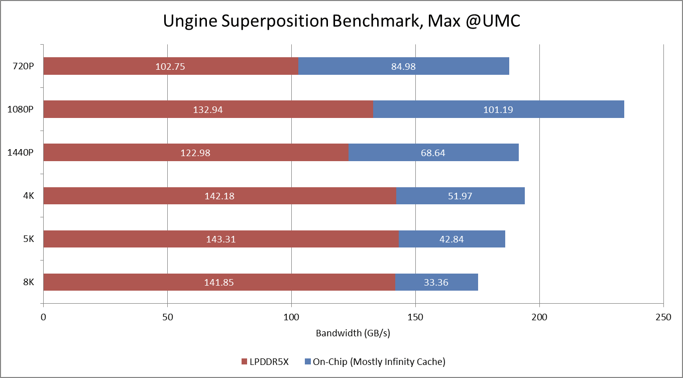 If Strix Halo’s iGPU were capable of delivering over 30 FPS in Superposition, AMD would definitely need a larger cache, more DRAM bandwidth, or a combination of both. Taking a simplistic view and tripling maximum observed 8K bandwidth demands would give a figure just north of 525 GB/s. But Strix Halo’s iGPU clearly wasn’t built with such a scenario in mind, and AMD’s selected combination of cache capacity and DRAM bandwidth works well enough at all tested resolutions. While high resolutions create the most DRAM traffic, 1080P shows the heaviest bandwidth demands at the Infinity Fabric level.