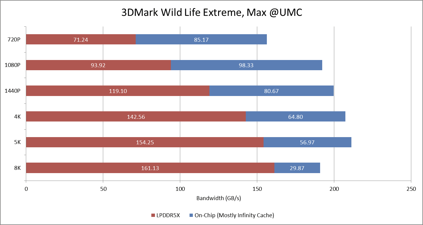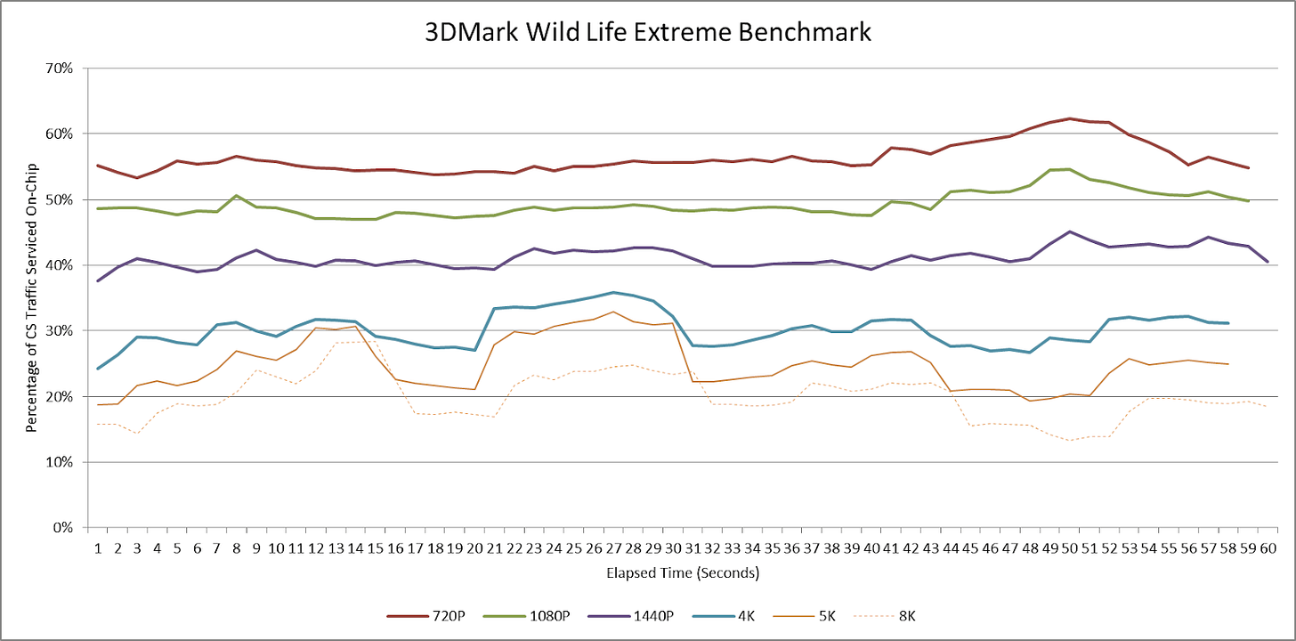 Bandwidth demands are more important than hitrates. Curiously though, Wild Life Extreme experiences increasingly severe hitrate dips at higher resolutions around the 16-19 and 45-52 second intervals. Those dips barely show at 1440P or below. Perhaps a 32 MB cache’s efficacy also shows more variation as resolution increases.