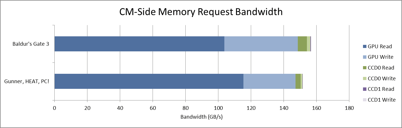 CPU-side traffic in general presents a more significant issue. Strix Halo’s Infinity Cache narrowly targets the GPU, and only GPU-side memory requests cause cache fills. CPU memory accesses will be counted as misses in a hitrate calculation. That may be technically correct, but misses the point of Infinity Cache. Most memory traffic comes from the GPU, but there’s enough CPU-side traffic to create a bit more of an error bar than I’d like. Therefore, I want to focus on whether Infinity Cache is handling enough traffic to avoid hitting DRAM bandwidth bottlenecks.